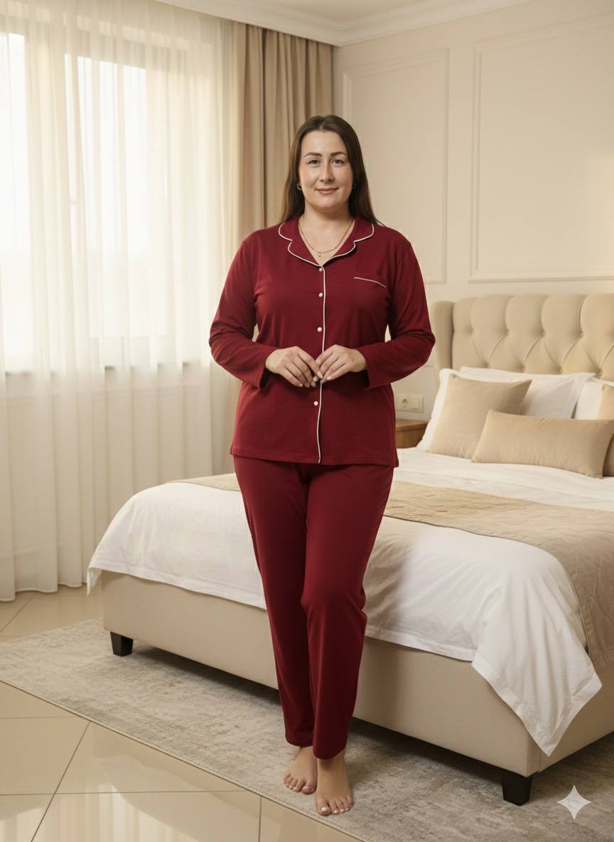 Жіноча піжама - виготовлена із щільної натуральної бавовни. Комплект: сорочка довгий рукав та штани. Піжаму з бавовни - комфортно носити, вона досить тепла, приємна на дотик та до тіла. Тіло в ній добре дихає. Саме через це бавовну називають білим золотом.