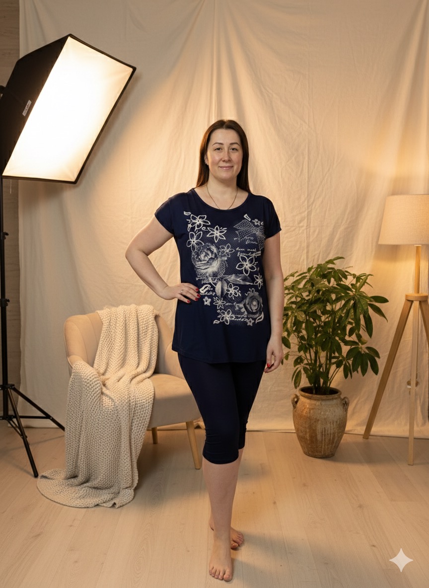 Склад: (натуральна тканина ) бавовна 95% та 5% еластанДовжина футболки 75 см; капрі 73 см